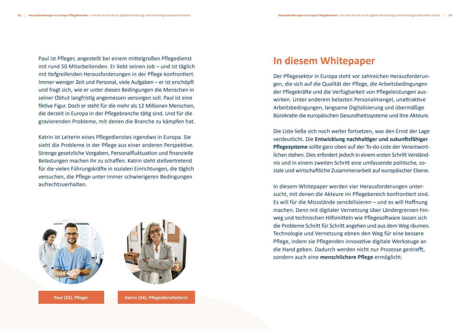 Arbeitskräfte in der Pflegebranche werden täglich mit Herausforderungen konfrontiert, die einen produktiven und effizienten Alltag hindern. Lernen Sie mit unserem Whitepaper „Herausforderungen in Europas Pflegebranche – und wie sie sich durch digitale Vernetzung und Technologie adressieren lassen“ Katrin und Paul kennen, um diese Challenges besser verstehen zu können.